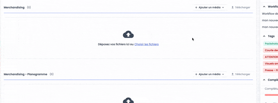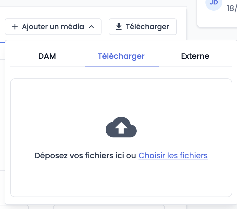 Télécharger un fichier en local. Déposer par glisser-déposer les fichiers dans la fenêtre, ou cliquez sur "Choisir les fichiers". Le nouveau média sera automatiquement associé au document et importer dans la classification par défaut du DAM.