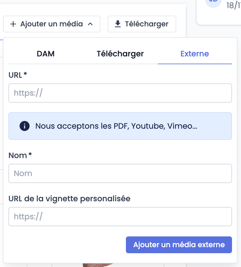 L'import depuis un lien externe voir la documentation Médias).