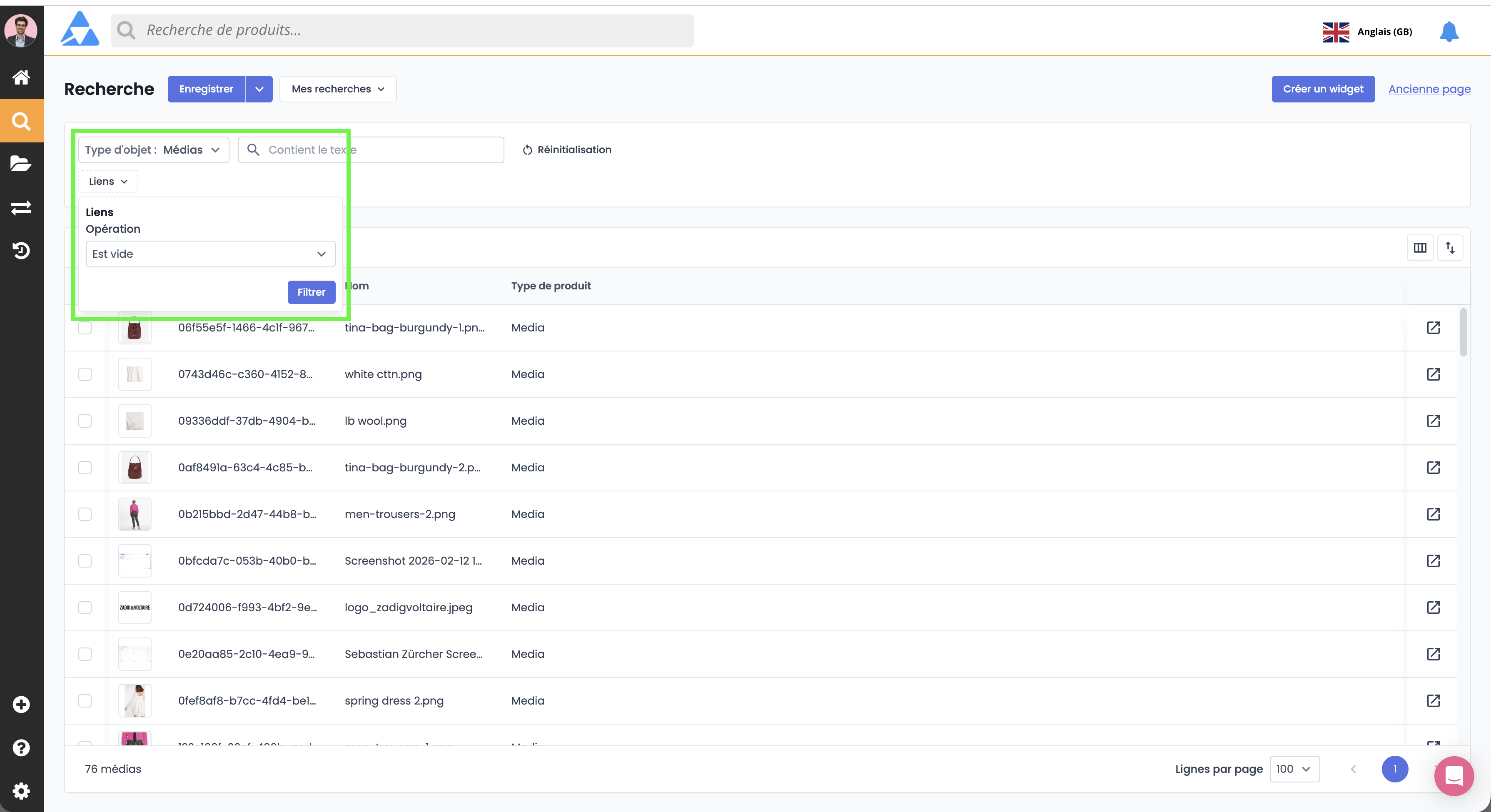 - Renseigner les critères suivants dans la zone de filtres : Type d’objet = Médias Filtre = Liens Opération = est vide