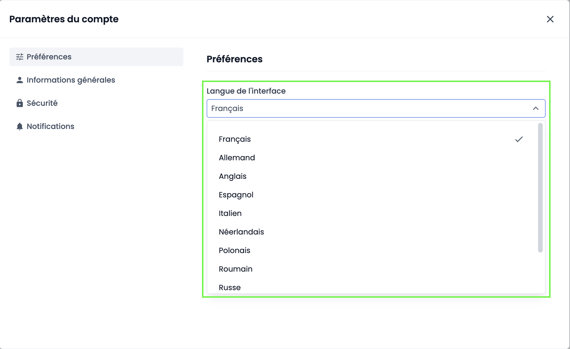 Les utilisateurs peuvent modifier la langue d'interface active via le profil utilisateur :