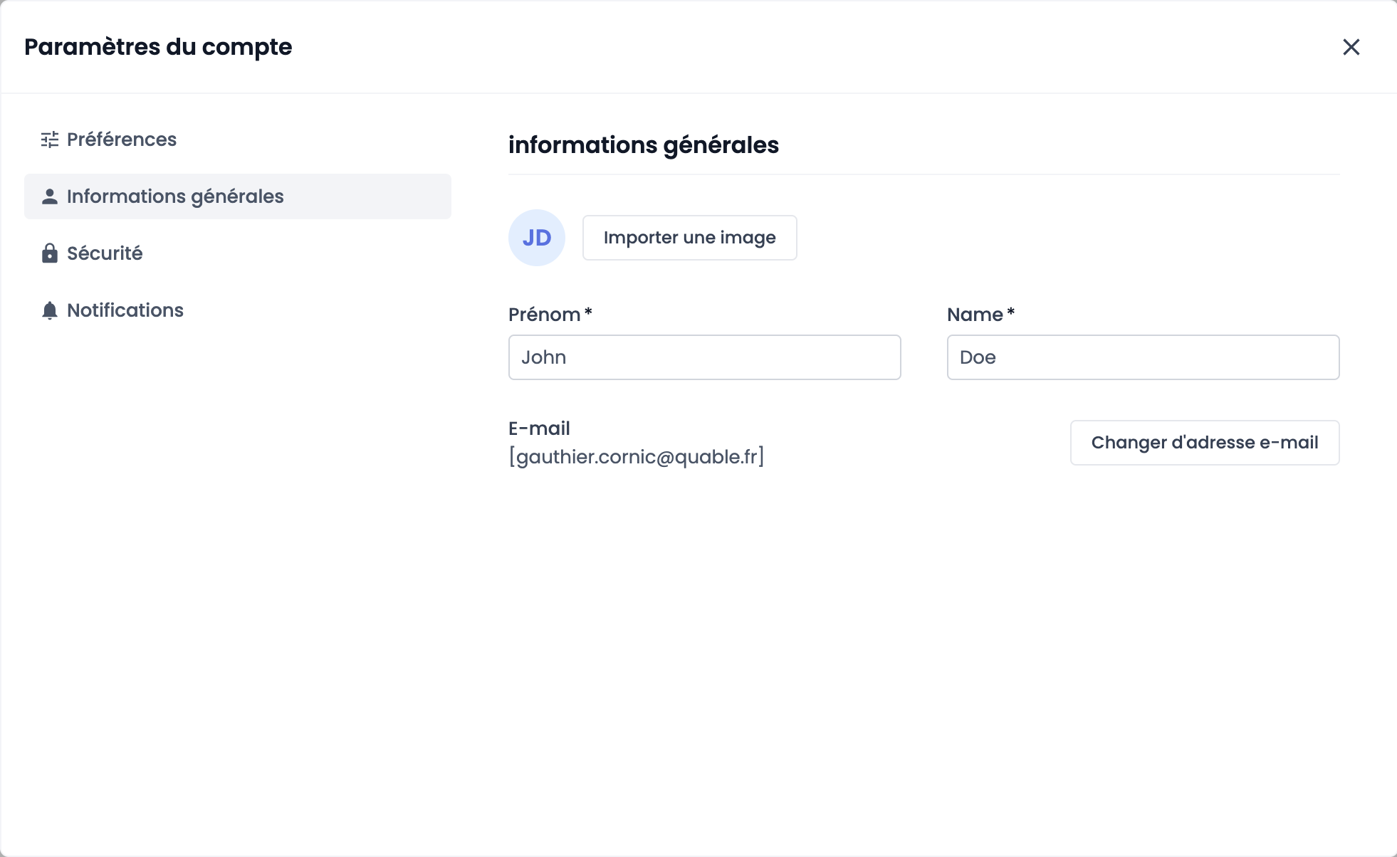 Les comptes utilisateurs sont créés et gérés par les administrateurs de Quable PIM, cependant vous pouvez modifier les informations dans les sections suivantes.