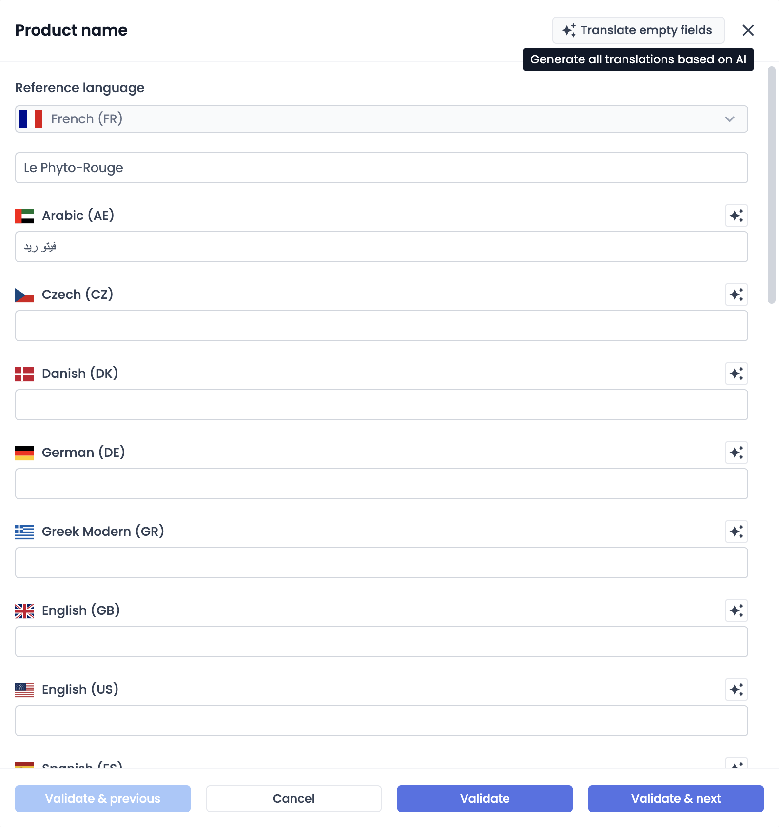 - La fonctionnalité de traduction des champs vides complète uniquement les champs sans données. Les champs déjà remplis restent inchangés.