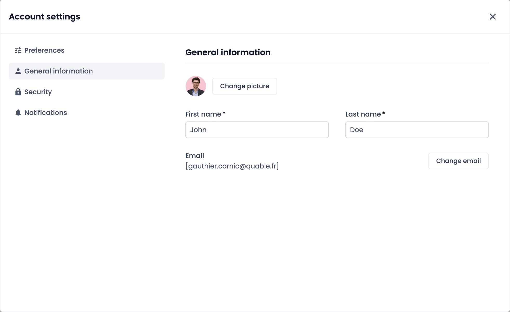 - If the connection to your Quable instance is made via SAML SSO authentication, the "change e-mail" button is grayed out: address change is not possible.
