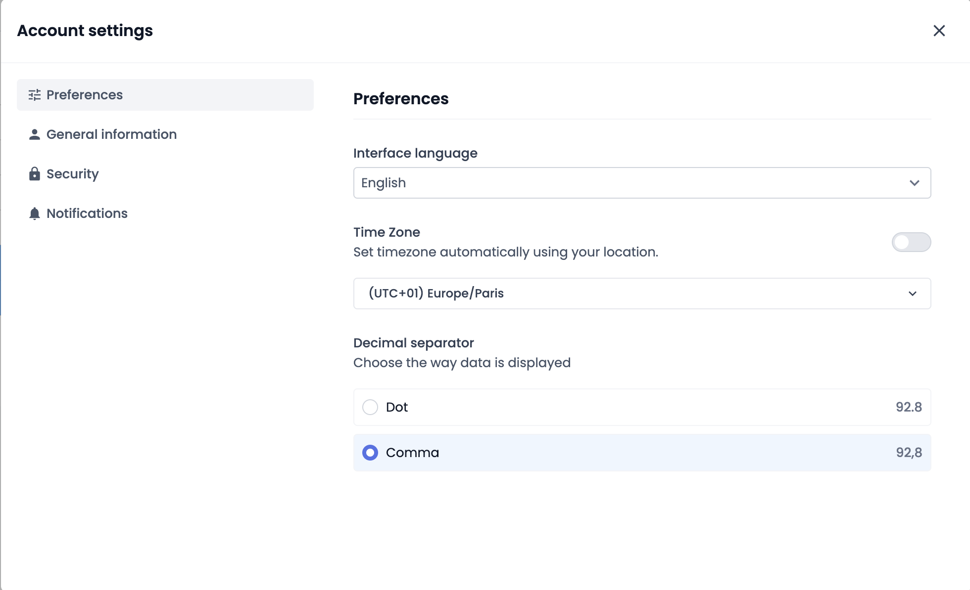 Choose how decimal numeric data is displayed, either with a dot or a comma.