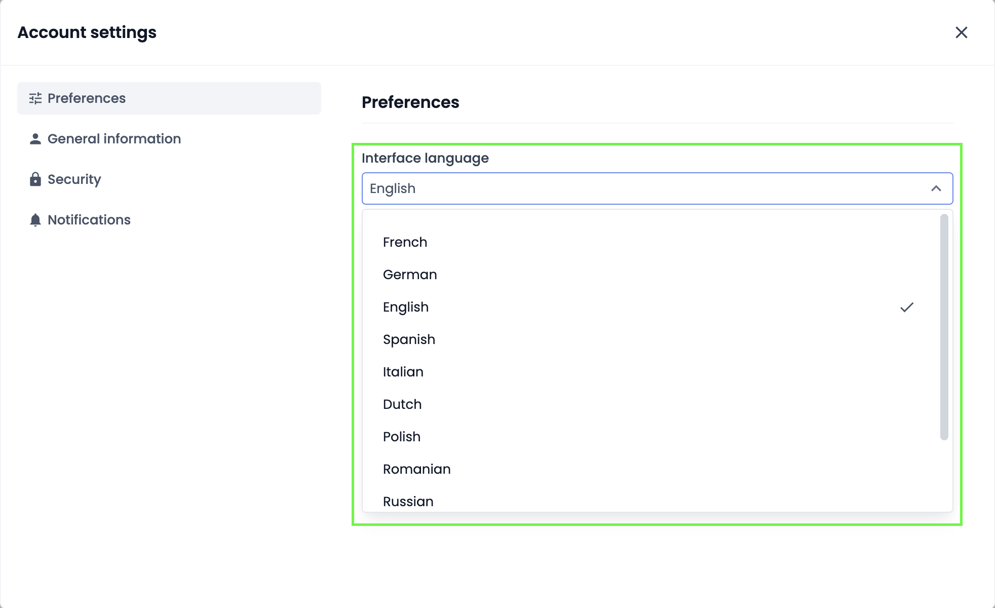 - In the “Interface language” setting, click the dropdown menu and choose the language you want to apply to menus, buttons, and other Quable PIM interface elements